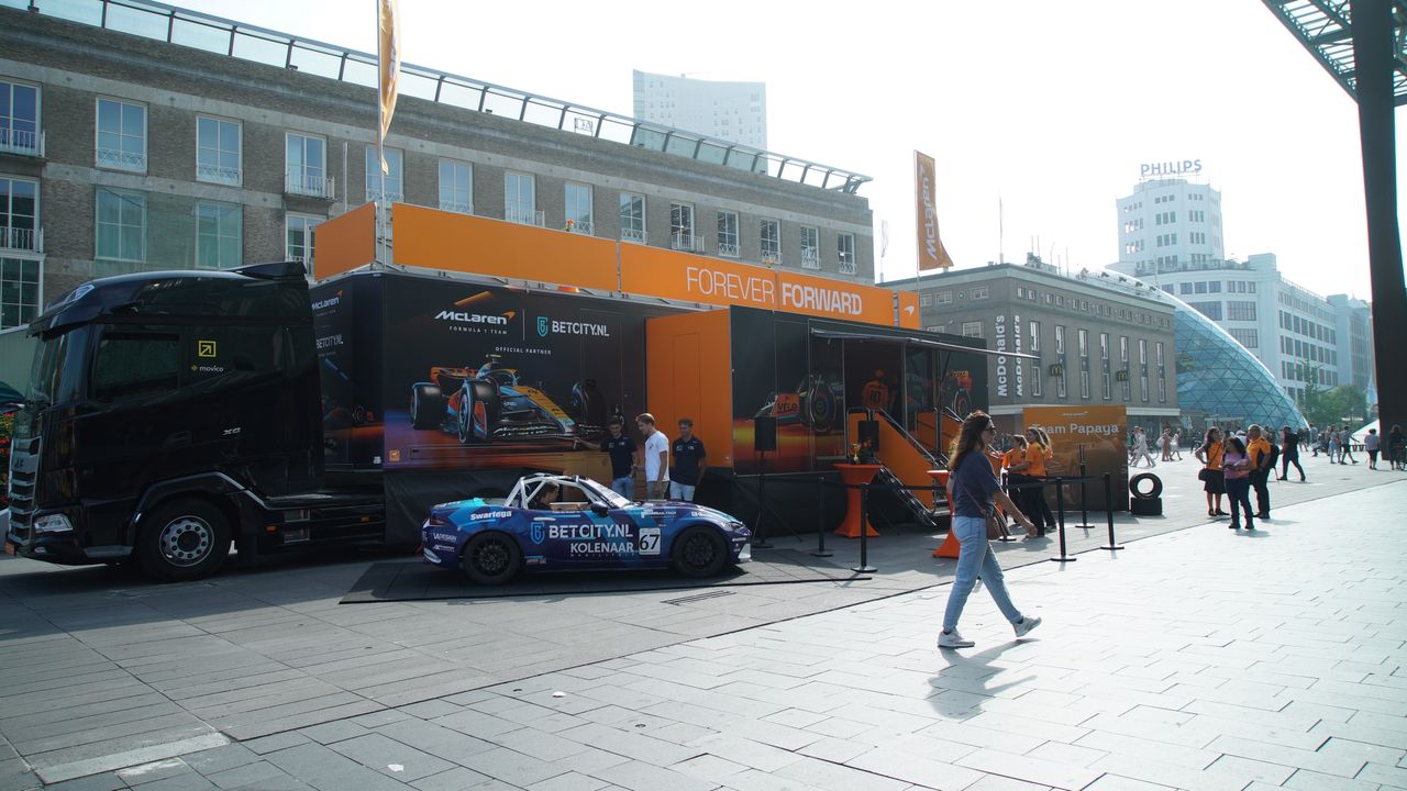 Op het 18 Septemberplein staat een grote truck met daarvoor een sportwagen, waar veel mensen op afkomen. De meeste die een kijkje komen nemen zijn fan van Max Verstappen en niet van Lando Norris, de nummer 1 coureur van McLaren. Maar dat mag de pret niet drukken. “McLaren is verre van een concurrent, dus dit is ook een keer leuk om te zien”, zegt Göran.