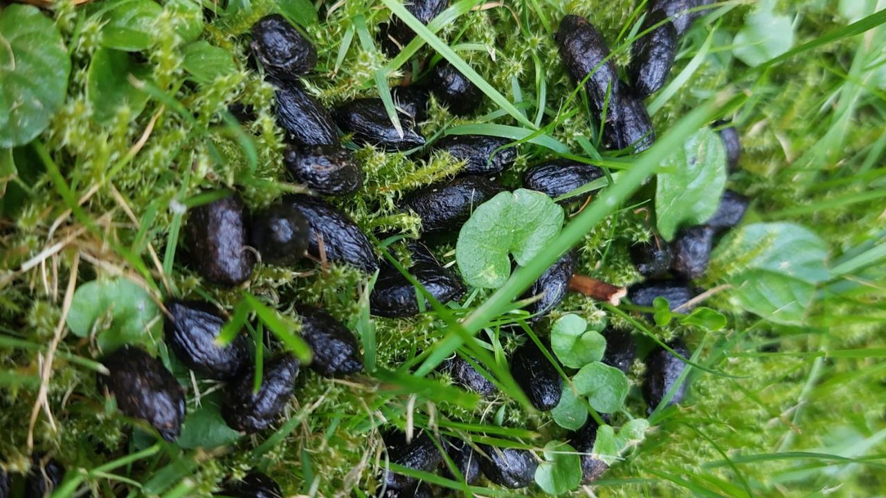 Toine van Erp vond in de tuin van zijn dochter in Voorne-Putten keutels en vroeg zich af van wie de keutels waren en stuurde mij een foto. Volgens mij zijn het reeënkeutels, want de keutels zijn enigszins donker, bijna zwart, en aan de ronding zitten wat puntjes. Dat zijn typische kenmerken voor de keutels van reeën.