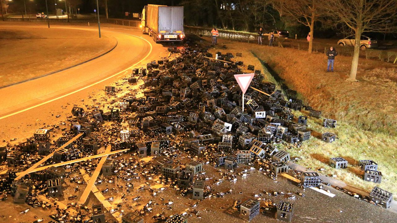 In Helmond lag een rotonde helemaal bezaaid met bierflesjes, nadat de lading begon te schuiven. Toen de vrachtwagen de rotonde op reed, vielen zo’n 150 tot 200 kratten bier uit de wagen. De weg is uiteindelijk met een veegwagen schoongemaakt.
