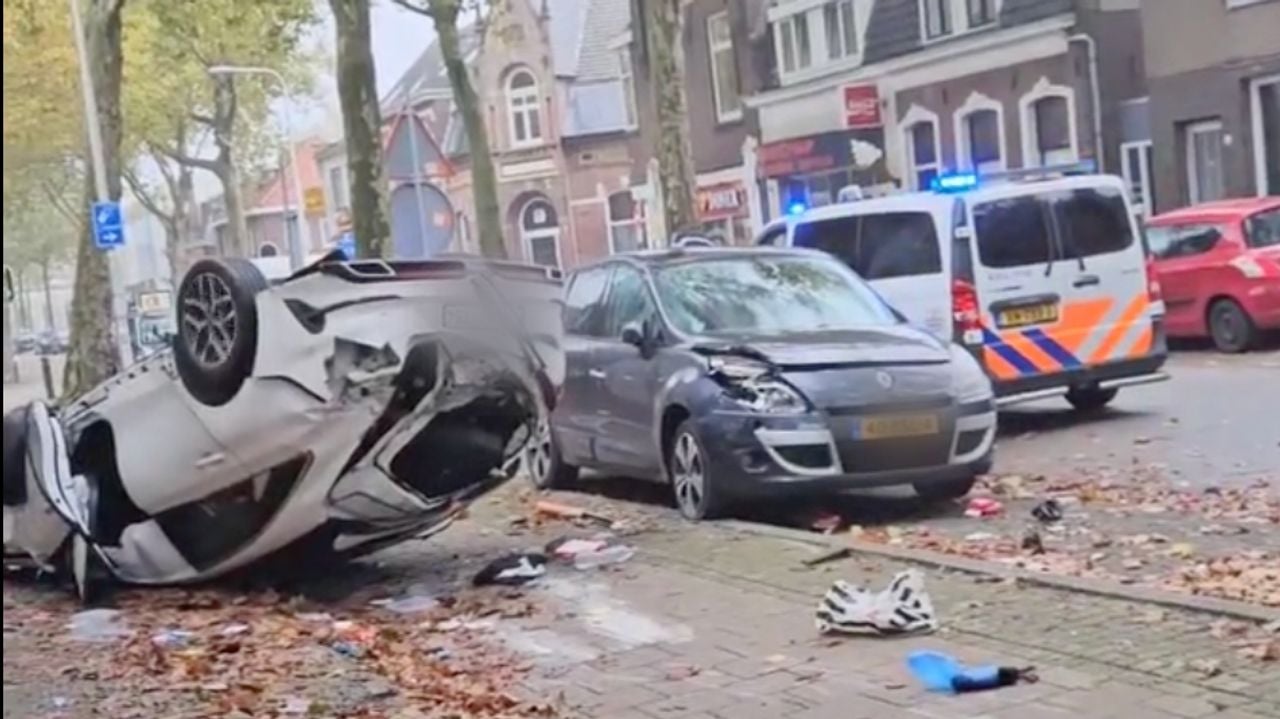 Enorme chaos na achtervolging: man raakt fietsers, auto op de kop