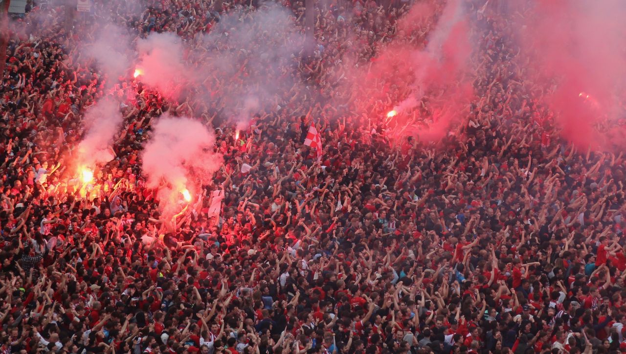 Als de huldiging op het bordes, het hoogtepunt van de feestelijkheden, rond de klok van half acht nadert, barst het feest op het Stadhuisplein nóg meer los. Met nóg meer vuurwerk en fakkels. Met als gevolg: geen enkel zicht op het podium waar de spelers zich ein-de-lijk laten zien.