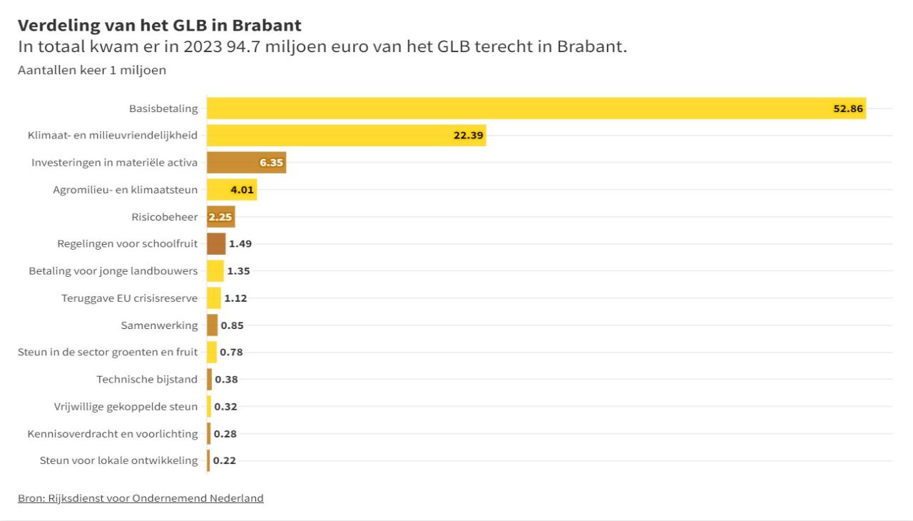 In heel Nederland werd 918,6 miljoen GLB-subsidie verdeeld. Het Brabants deel daarvan is ongeveer 11 procent. Dat Brabant in 2023 8 miljoen euro minder kreeg dan het jaar ervoor, komt doordat het GLB als geheel krimpt. De EU wil dat het GLB meer gericht is op duurzaamheid en gerichtere steun voor kleine bedrijven. Ook werden de voorwaarden om subsidie te krijgen strenger. Die hervorming ging per 2023 in.