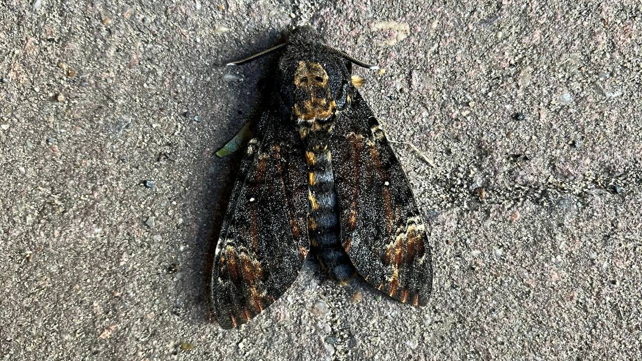 Hanneke Niessen vond in de tuin van haar vader in Gemert een grote, helaas dode, vlinder. Ze wil graag weten welke soort het is. Dit is een nachtvlinder van de mooie nachtvlinderfamilie van de pijlstaartvlinders, de naam is doodshoofdvlinder. Doodshoofdvlinders zijn grote trekvlinders. Ze kwamen oorspronkelijk voor in het zuiden van Europa. Ze zijn zeldzaam in ons land, maar ze worden hier steeds meer waargenomen. Deze vlinders vliegen vooral in de nacht en proberen dan honingbijennesten binnen te dringen. Eenmaal in zo’n bijennest smullen ze van de honing in de cellen. In zo’n bijennest worden ze niet gedood, omdat de doodshoofdvlinder exact past tussen twee raten en bijen daardoor niet in staat zijn de kwetsbare buik te bereiken. Dat is anders in honingbijenkasten. Daar zitten de raten wat verder uit elkaar en dan kunnen de honingbijen zo’n vlinder wel doodsteken. Op dit moment kunnen doodshoofdvlinders in ons land nog niet overwinteren, maar het zal mij niet verbazen als dit binnenkort wel het geval is.