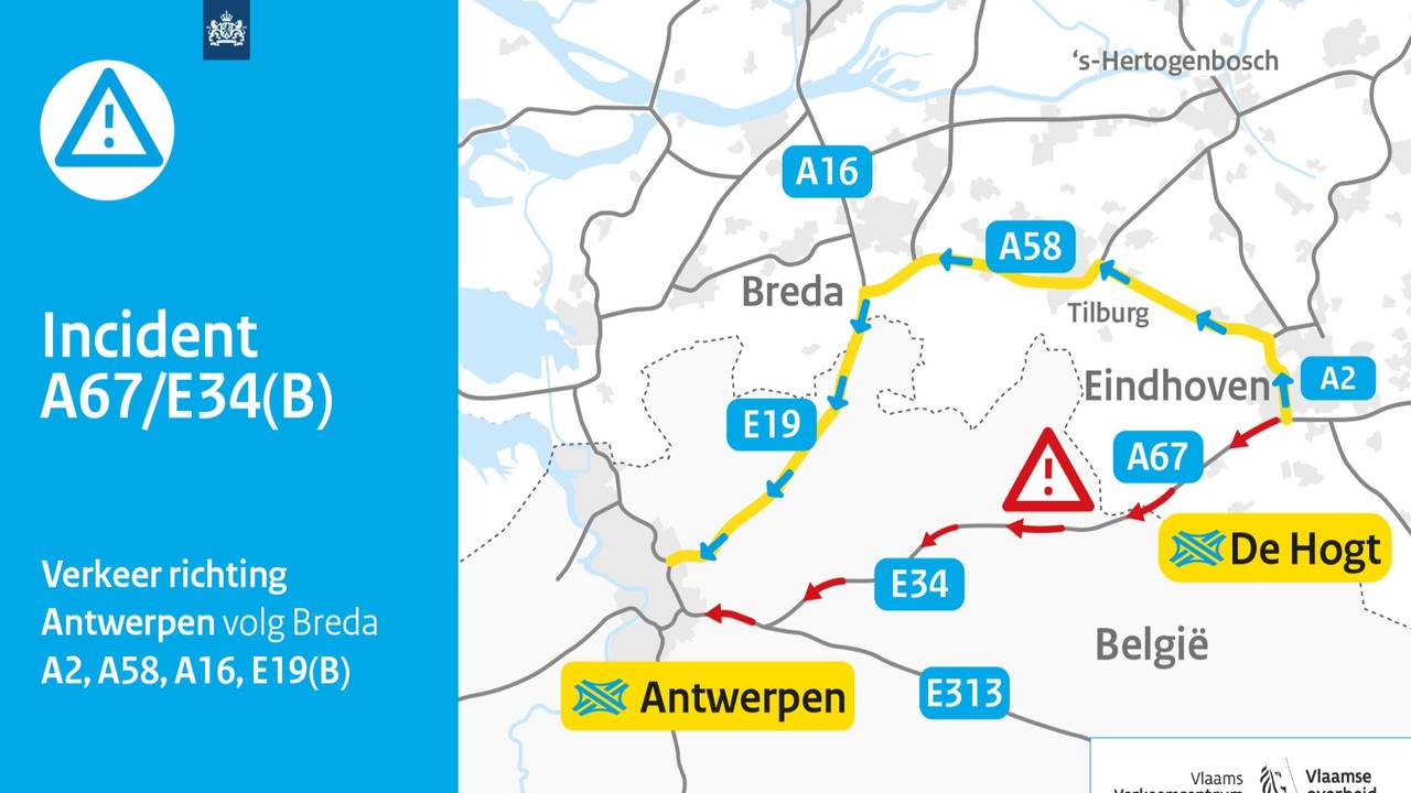 Verkeer dat vanuit de omgeving Eindhoven richting België wil rijden, krijgt het advies niet de A67 te nemen maar om te rijden via Tilburg over de A2, de A58, de A16 en de Belgische E19. Dit vanwege wegwerkzaamheden over de grens.