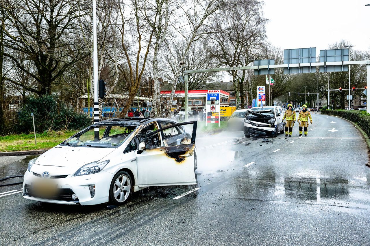 Omstanders hebben dinsdagmiddag twee inzittenden uit een brandende auto gehaald, na een botsing op de kruising van de Ringbaan West en Baroniebaan in Tilburg.