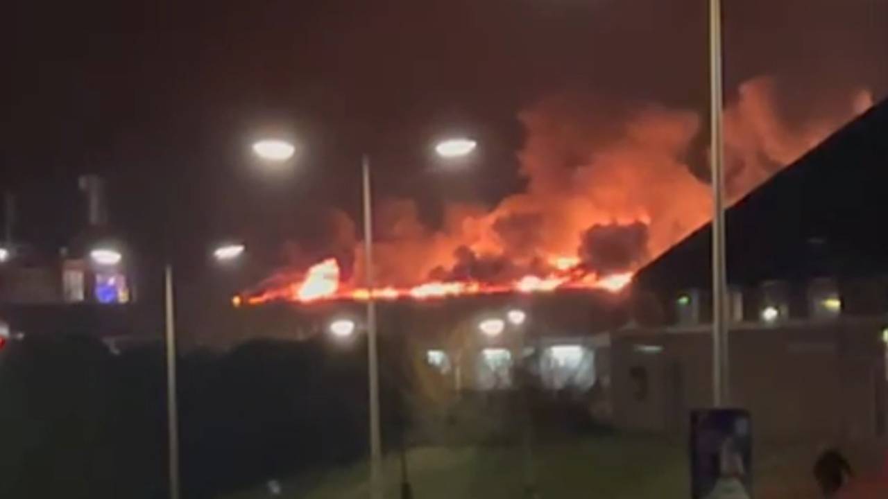 Vlammen metershoog boven dak supermarkt