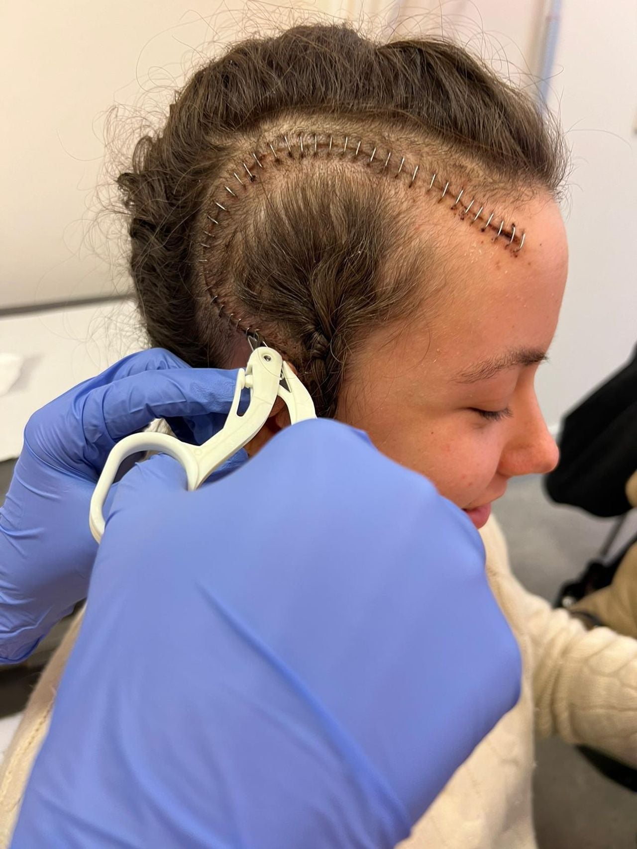 Artsen weten uiteindelijk 95 procent van de tumor weg te halen, door de zijkant van haar hoofd open te snijden. Het is een goed begin: "11,5 uur heb ik onder narcose gelegen. Ze hebben meer weg kunnen halen dan ze dachten."