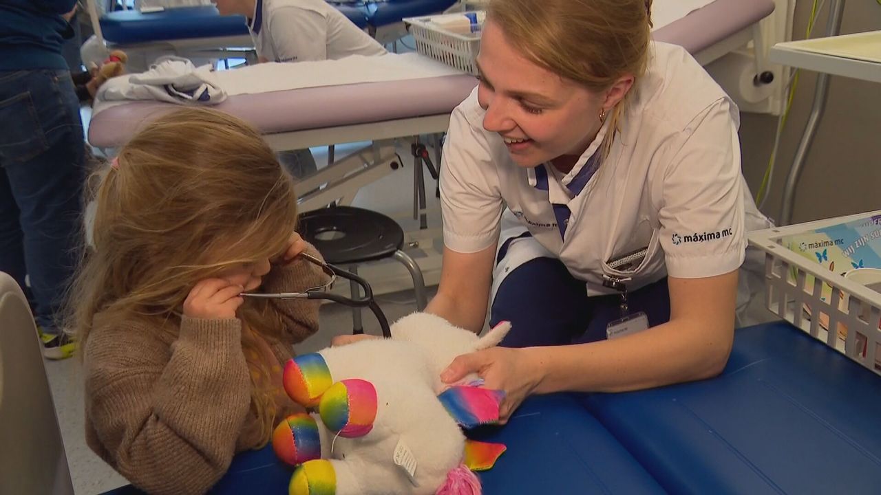 Ze mogen hun pluche vrienden op een bedje leggen, een spuitje geven, een pleister, of 'berenpilletjes'. Lees: plofrijst in een cupje. Zo ook Reva, een doktertje van drie jaar oud uit Heeze. Haar knuffel, Phoxy, is gevallen met voetballen. Dus moet hij naar het ziekenhuis, net als Reva zelf een keertje moest.