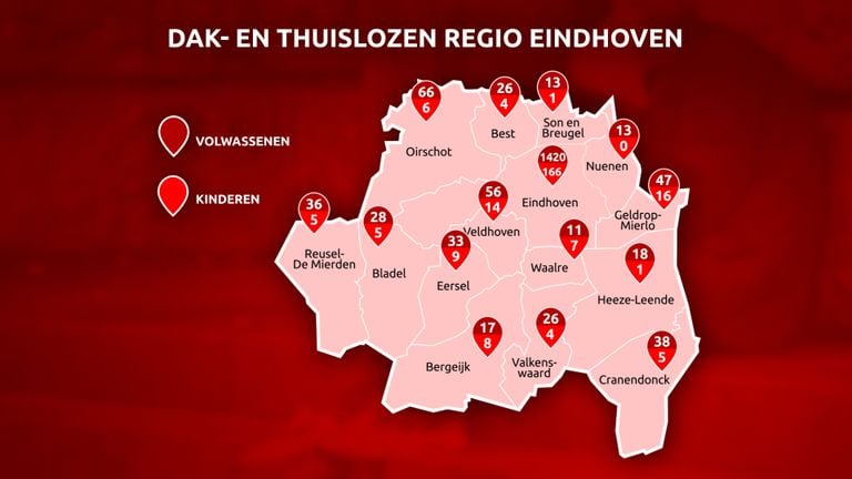 Ter vergelijking: Amsterdam-Amstelland: 13.070 dak- en thuislozen, waaronder 1718 kinderen. Regio Eindhoven: 2.441 dak- en thuislozen, waaronder 320 kinderen.