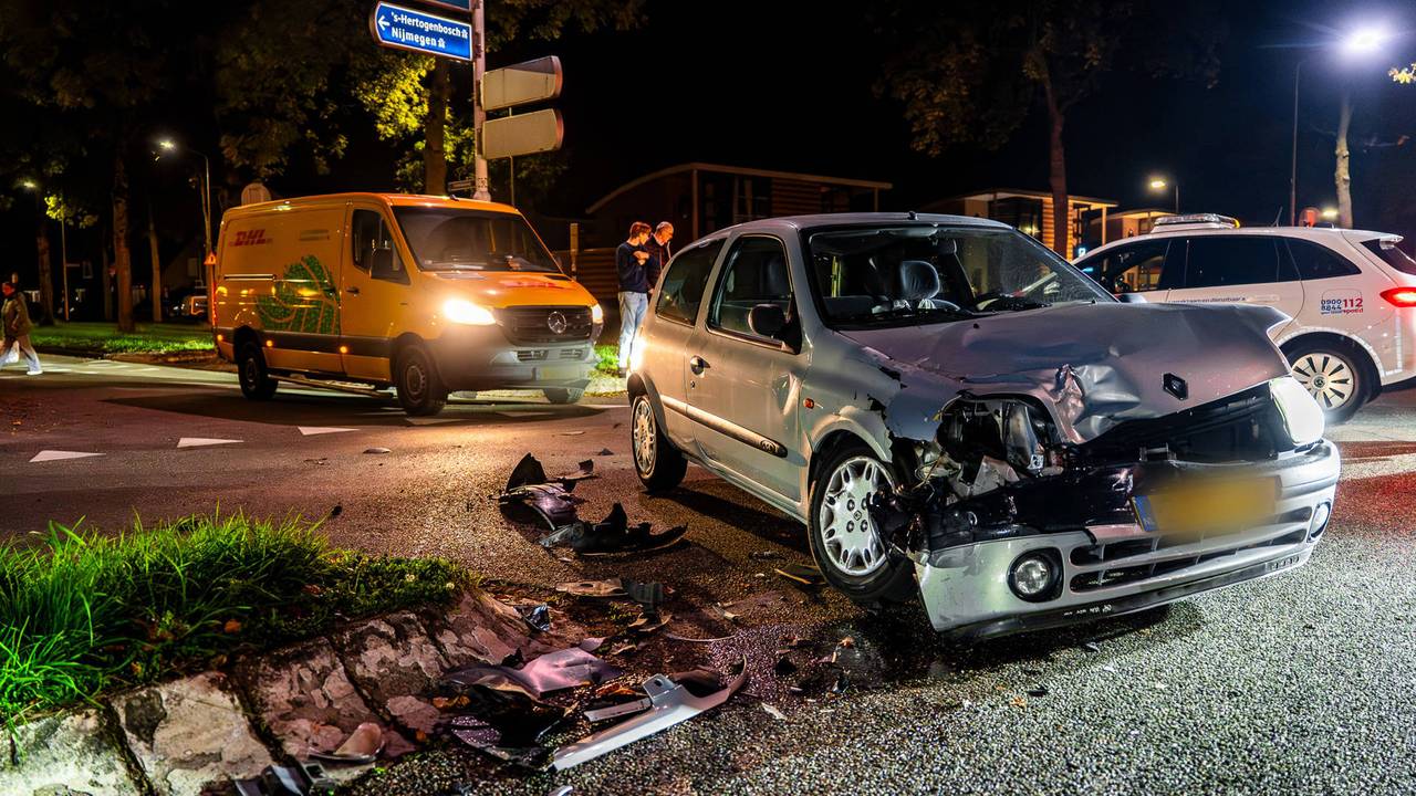 Een bestelbusje en een auto zijn woensdagavond tegen elkaar gebotst op de kruising van de John F. Kennedylaan en de Zaltbommelseweg in Oss. Een ambulance kwam ter plaatse om de slachtoffers na te kijken.