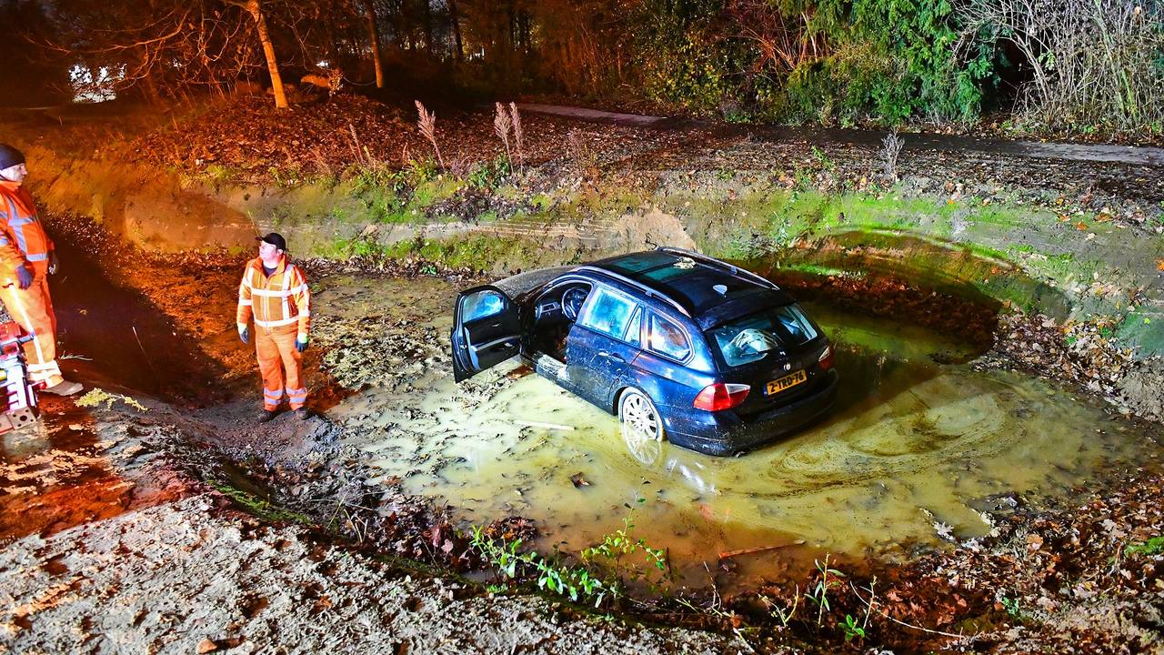 Auto belandt in waterbunker in Veldhoven, bestuurder naar ziekenhuis