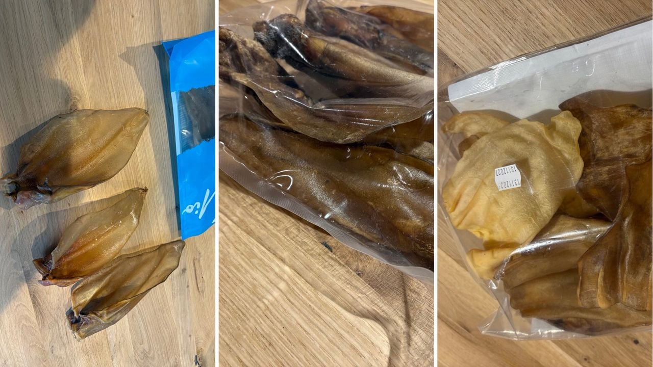De oren die Omroep Brabant kocht bij Zooplus, vlnr: SnackOMio, DIBO en George & Bob’s: