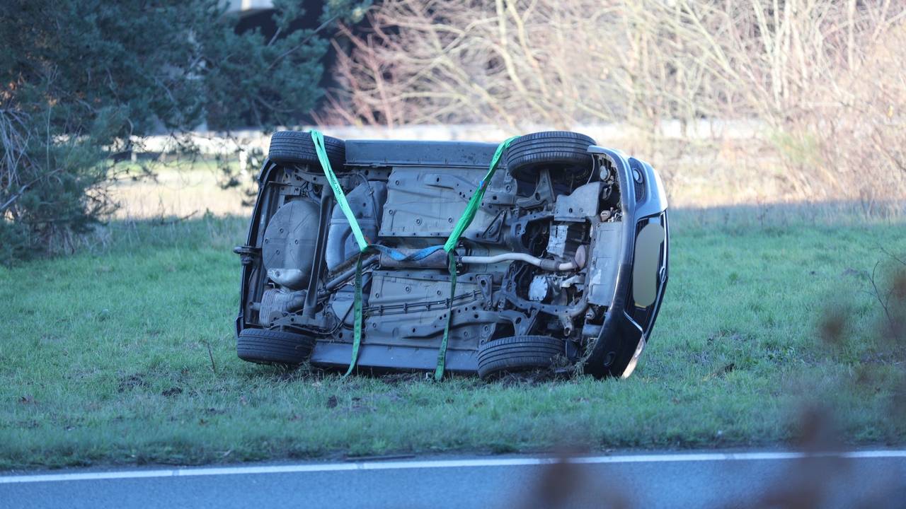 Een auto is woensdagochtend uit de bocht gevlogen en op de zijkant beland op de A4 bij Bergen op Zoom. De bestuurder is niet gewond geraakt.