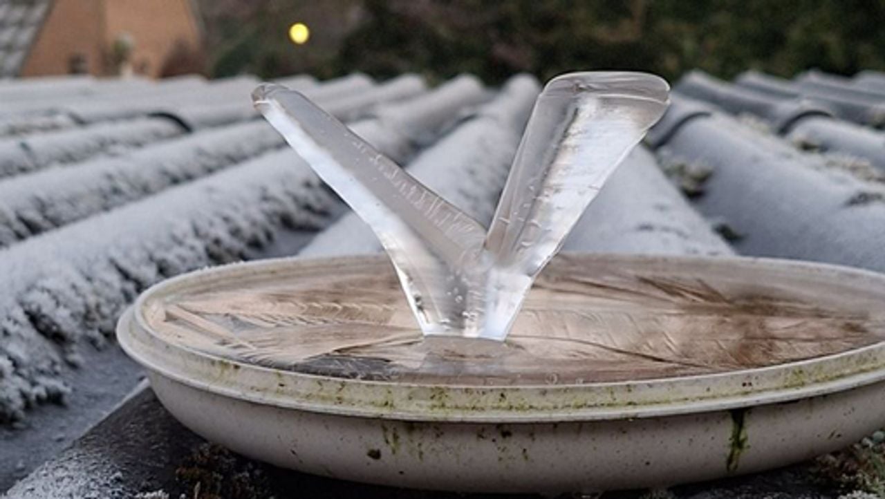 Een bijzondere verschijning in de vogeldrinkbak bij Jan en Jet uit Nuland. Twee ijsnaalden die leken op ijsstalagmieten, maar een het bleken ‘ijsnaalden’ te zijn. Ook wel omgekeerde ijspegels. “Die zie je ook niet elke dag”, weet Frans.