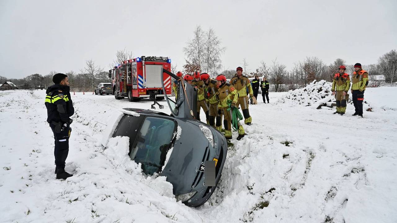 Auto glijdt in Oss door gladheid van de weg en komt in sloot tot stilstand