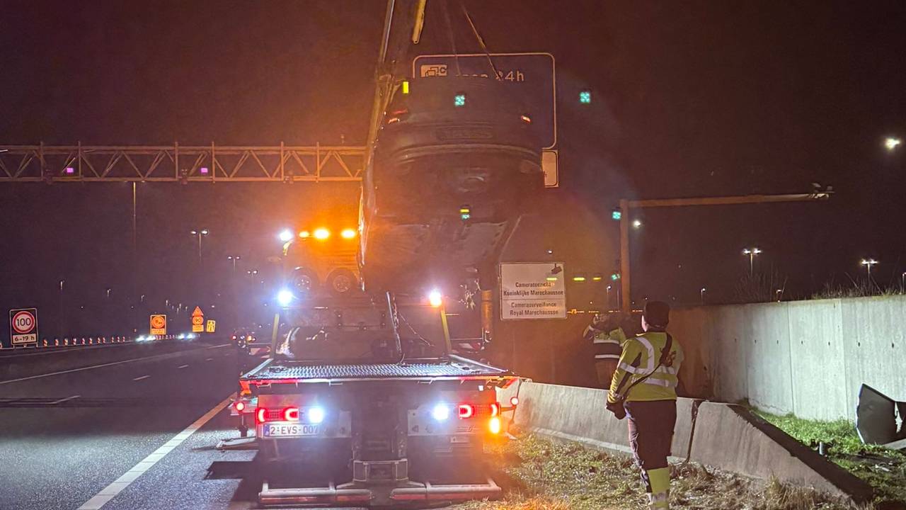 Auto crasht, raakt verkeersbord en schiet over betonbarrière in buitenberm