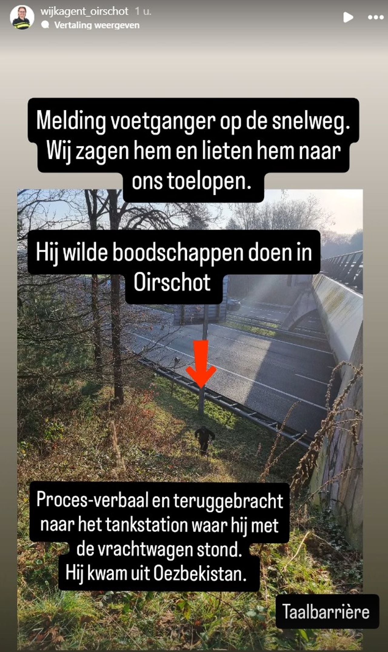De vrachtwagenchauffeur uit Oezbekistan kreeg een proces-verbaal vanwege het lopen op de snelweg. Vervolgens werd de man door de agenten naar het tankstation gebracht waar zijn vrachtwagen stond.