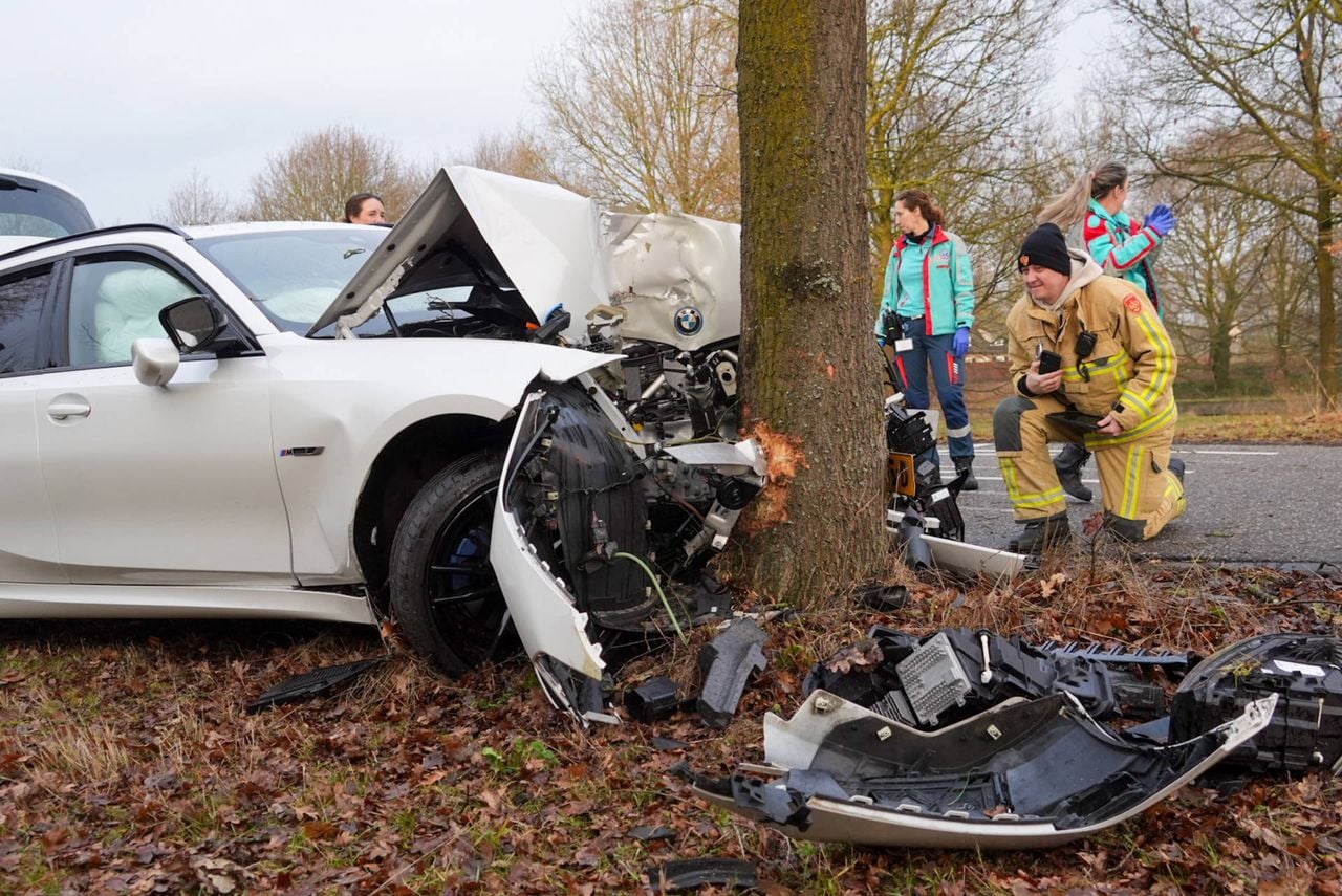 Een auto is zondagochtend op een boom gebotst bij Deurne. Het ging mis op de afrit naar het centrum van het dorp.