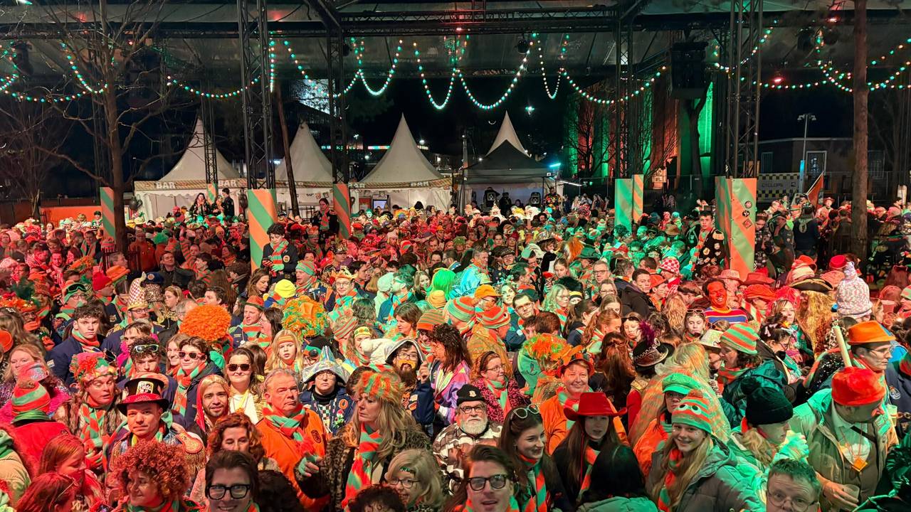 Nog hééél even! De mensen in de tent van Club Alaaf in Rommelgat (Veldhoven) zijn zich aan het opstellen voor de polonaise. Over ongeveer tien minuten gaat de recordpoging beginnen.