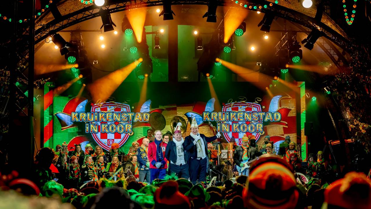 Ondanks het af en toe wat gure en regenachtige weer is het maandagavond genieten in Tilburg bij Kruikenstad in Koor. Het meezing-feest is voor het eerst op het Stadsforum in de binnenstad. En daar zingen vele honderden carnavalsvierders uit volle borst mee.