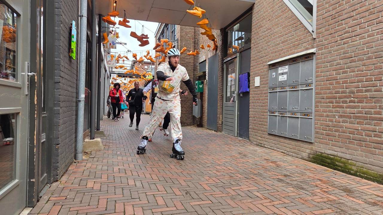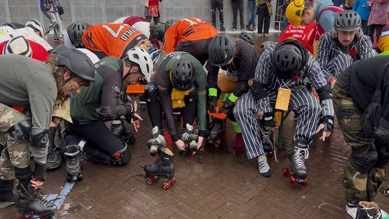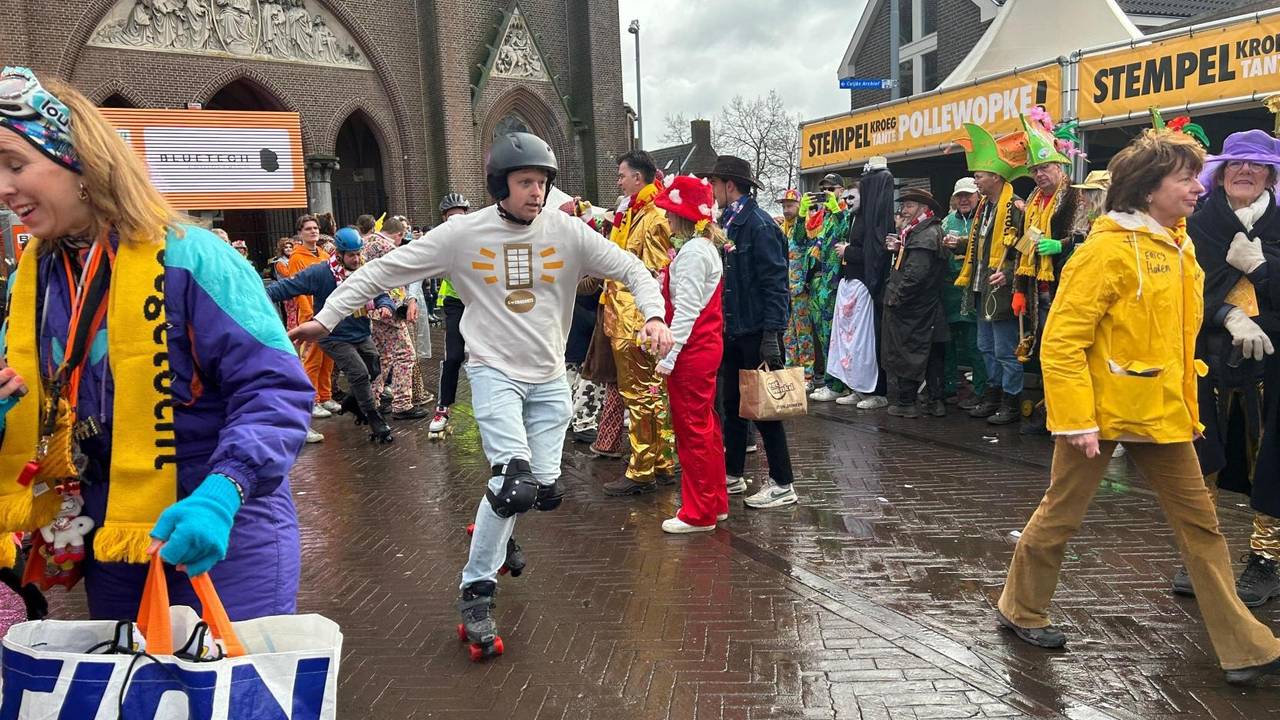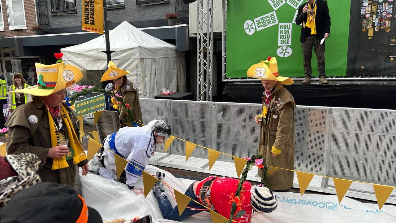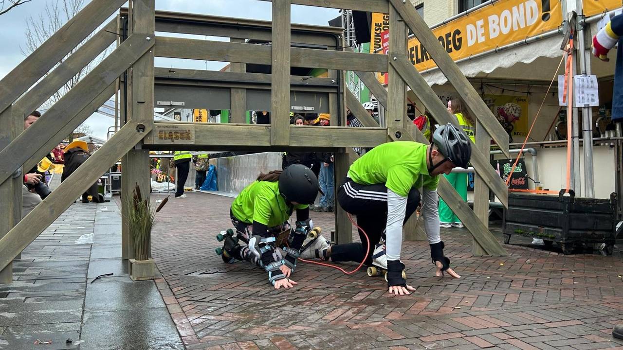 Rolschaatsen, shotten, struikelen en weer door. Tijdens de jaarlijkse Kuukse Elfkroegentocht in het centrum van Cuijk namen 35 teams het tegen elkaar op. De prins en zijn adjudant begonnen fanatiek… en toen ging de prins vrijwel meteen onderuit.