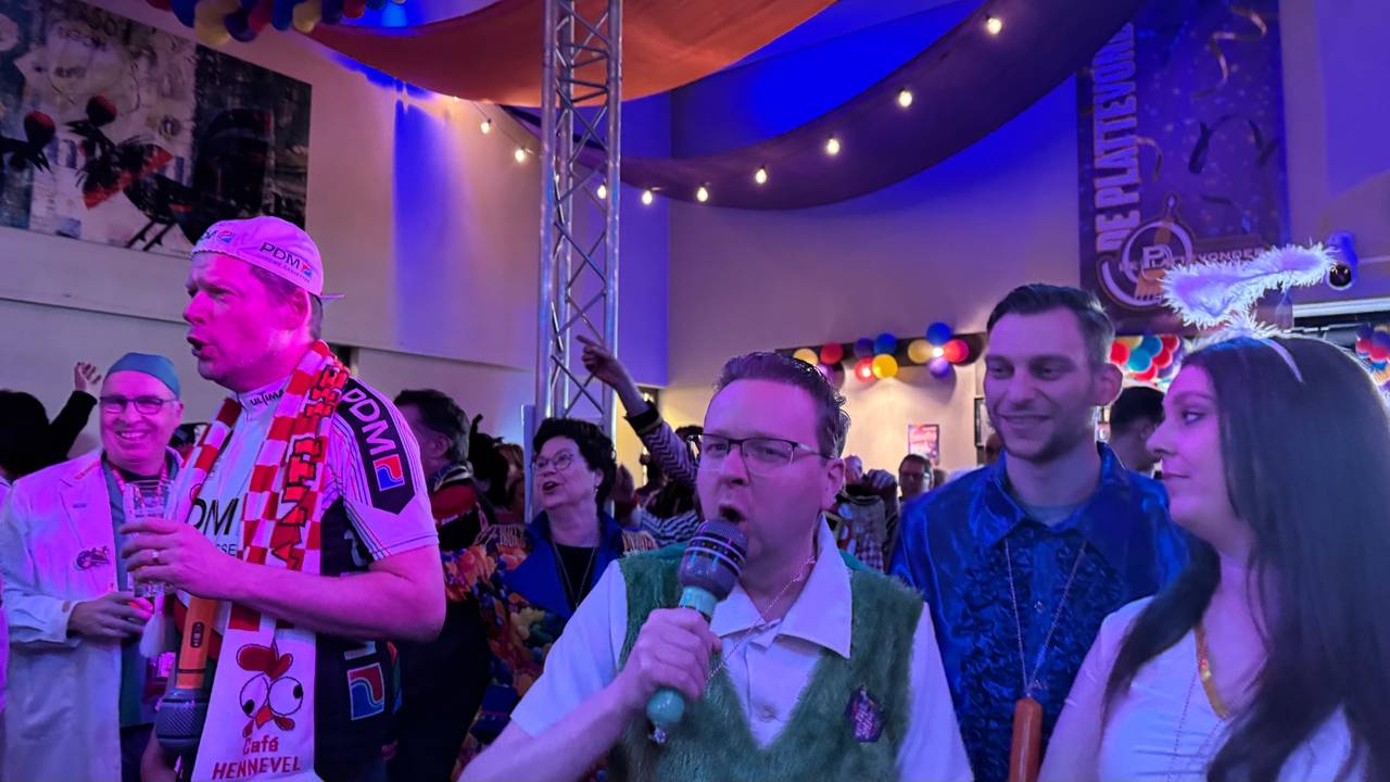 Op een pleintje bij de boerderijen stonden zo’n 210 mensen te swingen en te feesten toen de zanger ineens opdook. Niemand had het zien aankomen. “Ik weet het allemaal niet. Ik weet het allemaal niet. Staan we ineens hier bij Lamme Frans”, zegt een verbaasde carnavalsvierder.