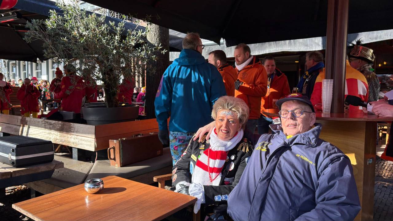 Ton en Ingrid zijn al voor de vijfde dag aan het carnavallen en hebben een mooi plekje in de zon uitgekozen, met goed zicht op het kampioenschap.