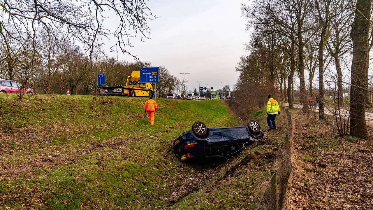 Auto vliegt uit de bocht op A73 bij Cuijk en belandt op de kop