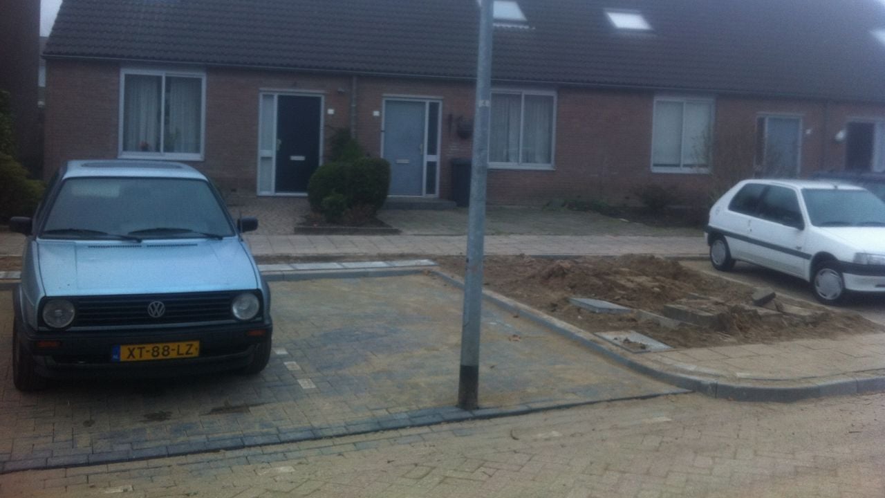 Ook in Oosterhout gaat het niet altijd goed met lantaarnpalen en parkeerplaatsen: het beeld spreekt voor zich. De paal is vrij snel na klachten van omwonenden verplaatst.