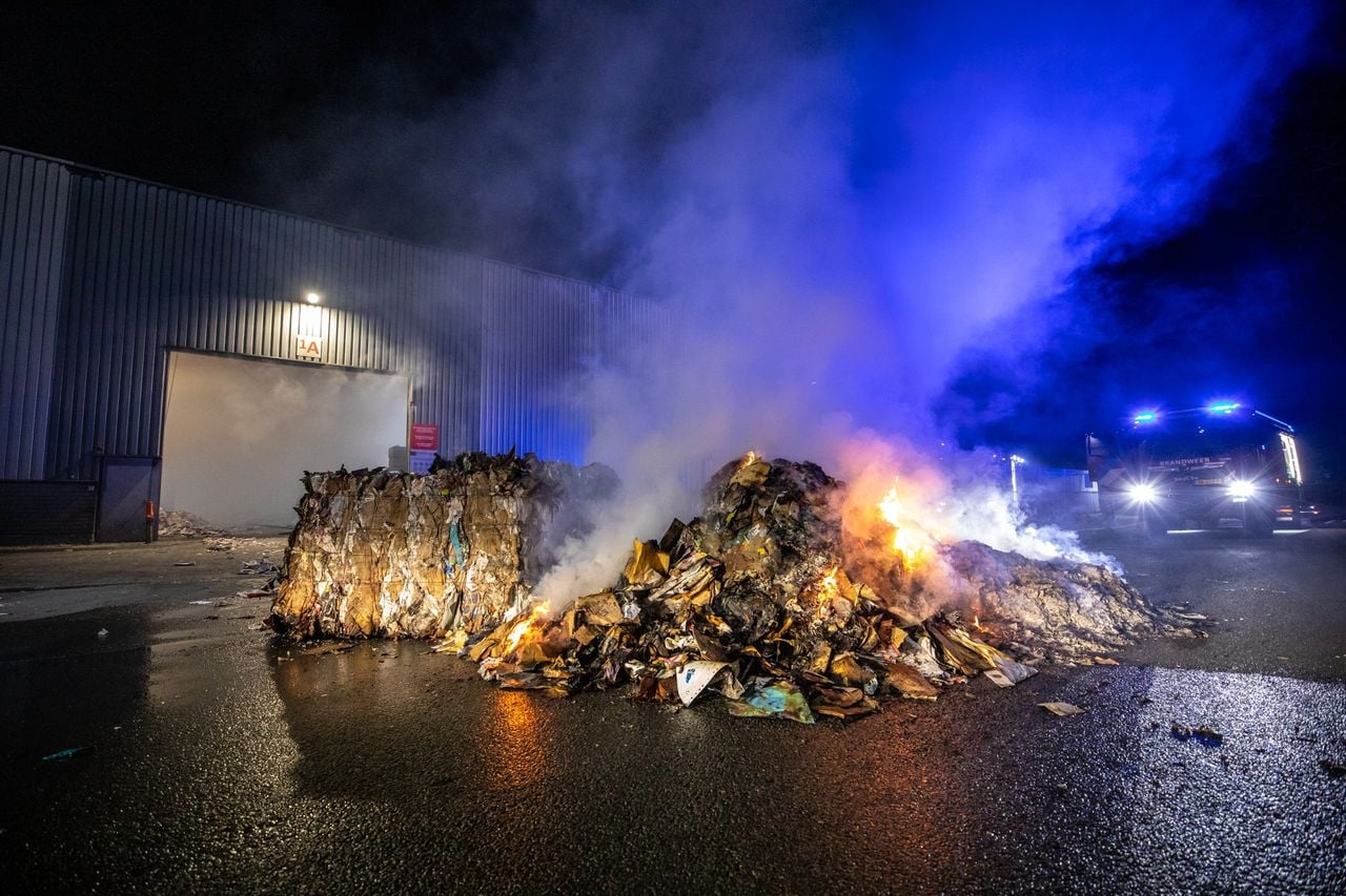 Brand bij recyclingbedrijf: stapels oud papier in brand