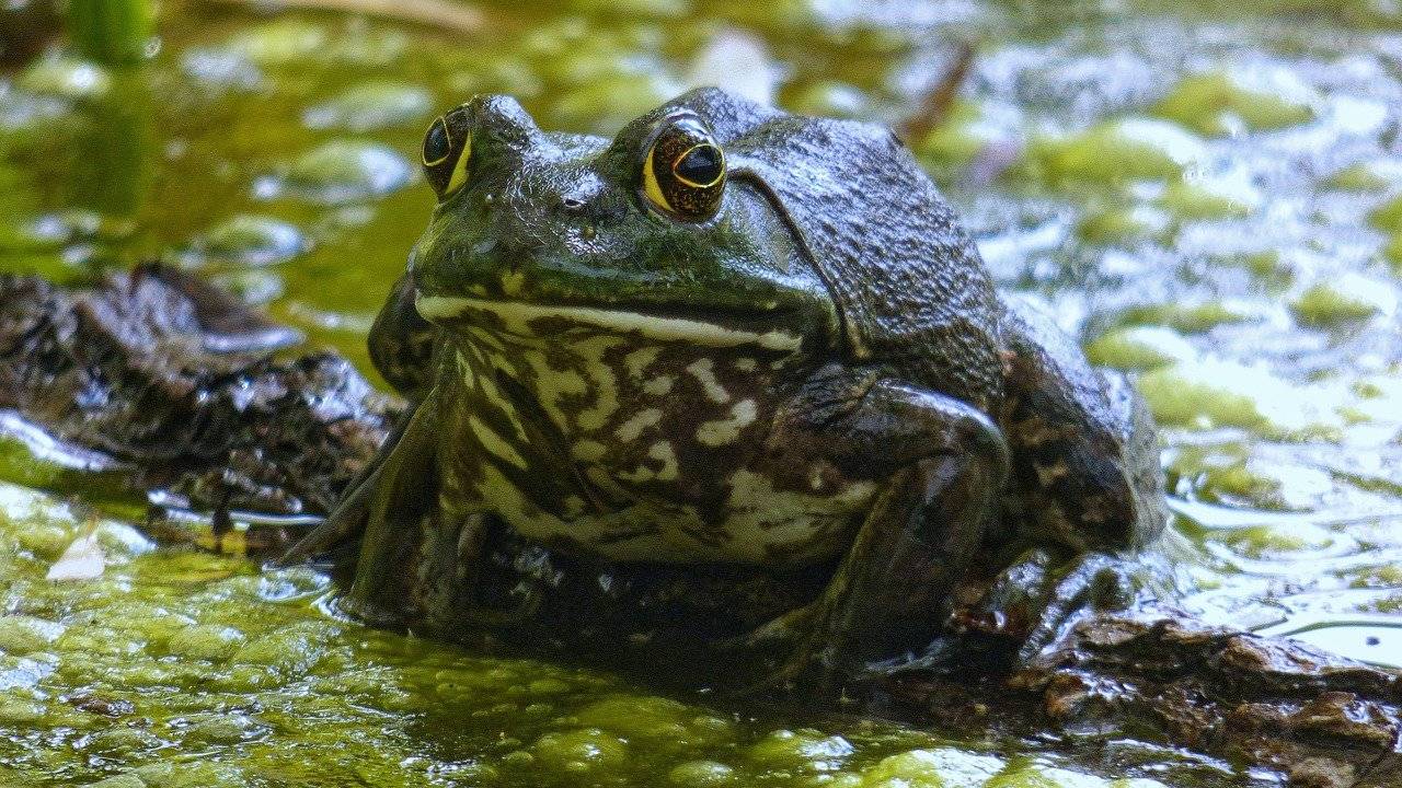 De Amerikaanse stierkikker is niet zomaar een kikker. Hij kan zo’n 25 centimeter groot worden, weegt ruim een halve kilo en maakt flink lawaai.
