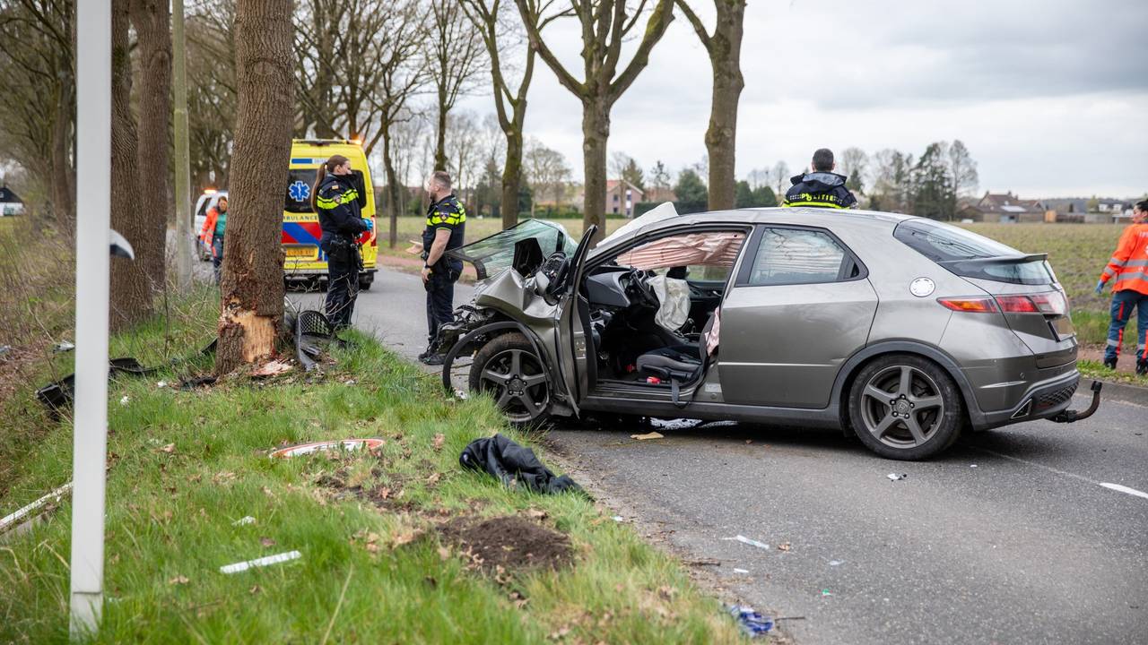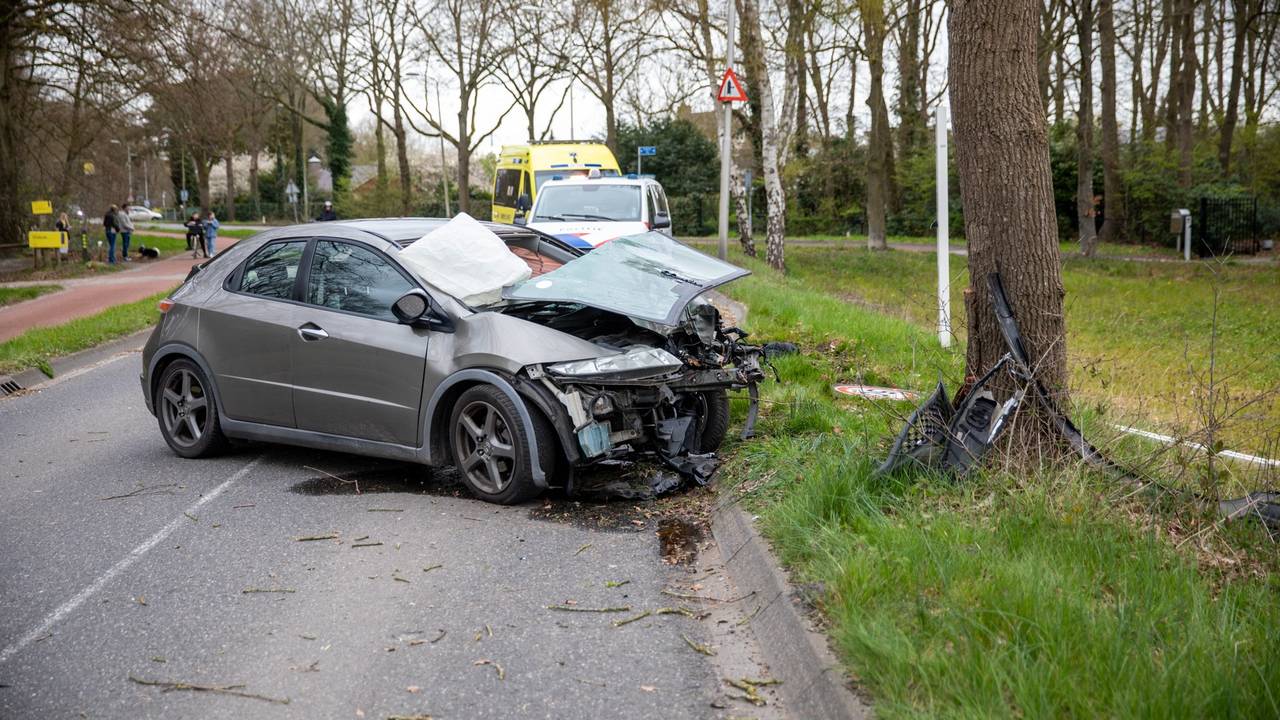 De auto kwam eerst aan de verkeerde kant van de weg terecht, reed een bord uit de grond en botste tegen een boom.