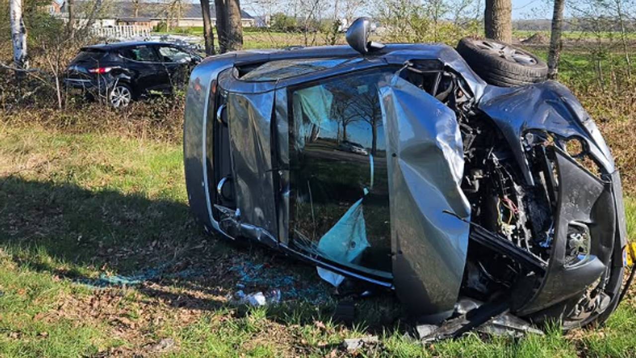 Een auto is dinsdagochtend op zijn kant beland na een botsing met een andere auto op de Ir. Mettropweg in Hoogeloon. De andere auto is in het weiland beland. De inzittenden raakten lichtgewond.