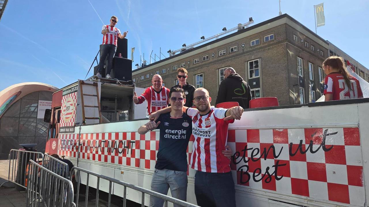 Vriendengroep uit Best heeft een platte karretje. "Veertien jaar geleden begonnen bij een kampioenschap. PSV is gewoon familie, iedereen met een PSV-hart die wij kennen lapt wat geld en dan gaan we mooi feestje bouwen." Dat doen ze dit jaar met een eigen dj aan het begin van het 18 Septemberplein, waar de platte kar straks langskomt.