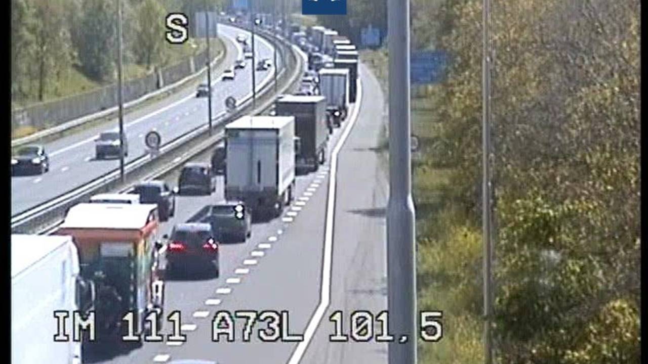 Op de A73 tussen Cuijk en Malden staat een lange file door een ongeluk. De vertraging is meer dan een uur.