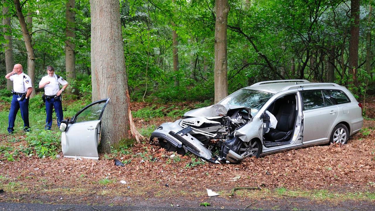 De auto raakte door nog onbekende oorzaak van de weg en reed tegen een boom rechts van de weg.