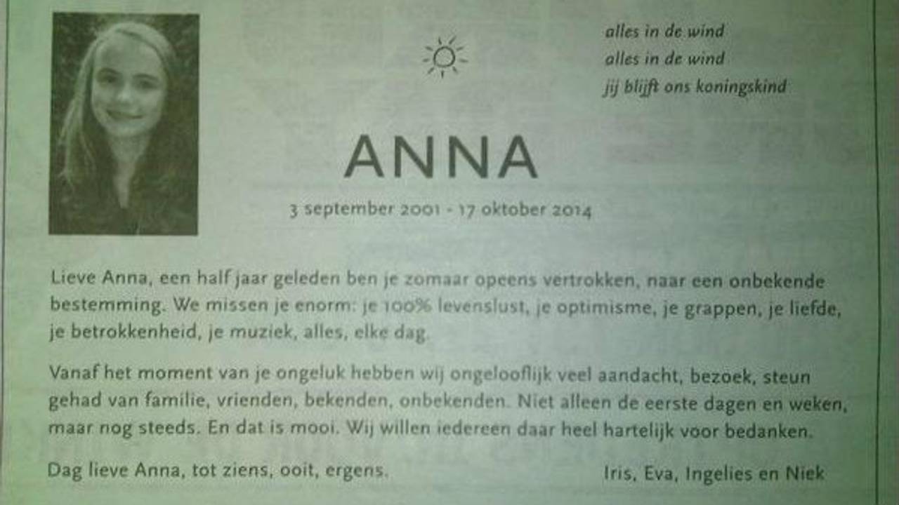 Filmpje omgekomen Anna van Keulen (13) is moderne manier van rouwen: 'Dit is het nieuwe bidprentje'29 oktober 2014Het ontroerende filmpje van de omgekomen 13-jarige Anna van Keulen uit Tilburg is binnen 24 uur de hele wereld over gegaan. In totaal is de tweet van haar vader Niek van Keulen ruim zesduizend keer geretweet. Het filmpje zelf is ruim driehonderdduizend keer bekeken. Rouwdeskundige Daan Westerink ziet de oproep van de vader als een manier om het grote verlies te verwerken.