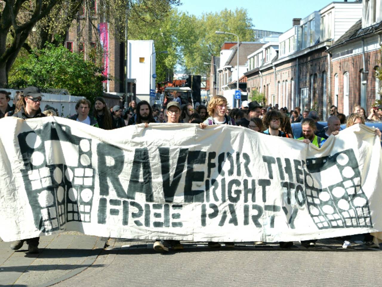 Honderden demonstreren tegen politiegeweld op illegale housefeesten in Tilburg19 april 2014Honderden demonstranten hebben zaterdagmiddag gedemonstreerd tegen politiegeweld op illegale housefeesten. Op een spanddoek was de tekst 'Rave free for the right to party' te lezen. Er was veel politie op de been, de demonstratie verliep rustig.