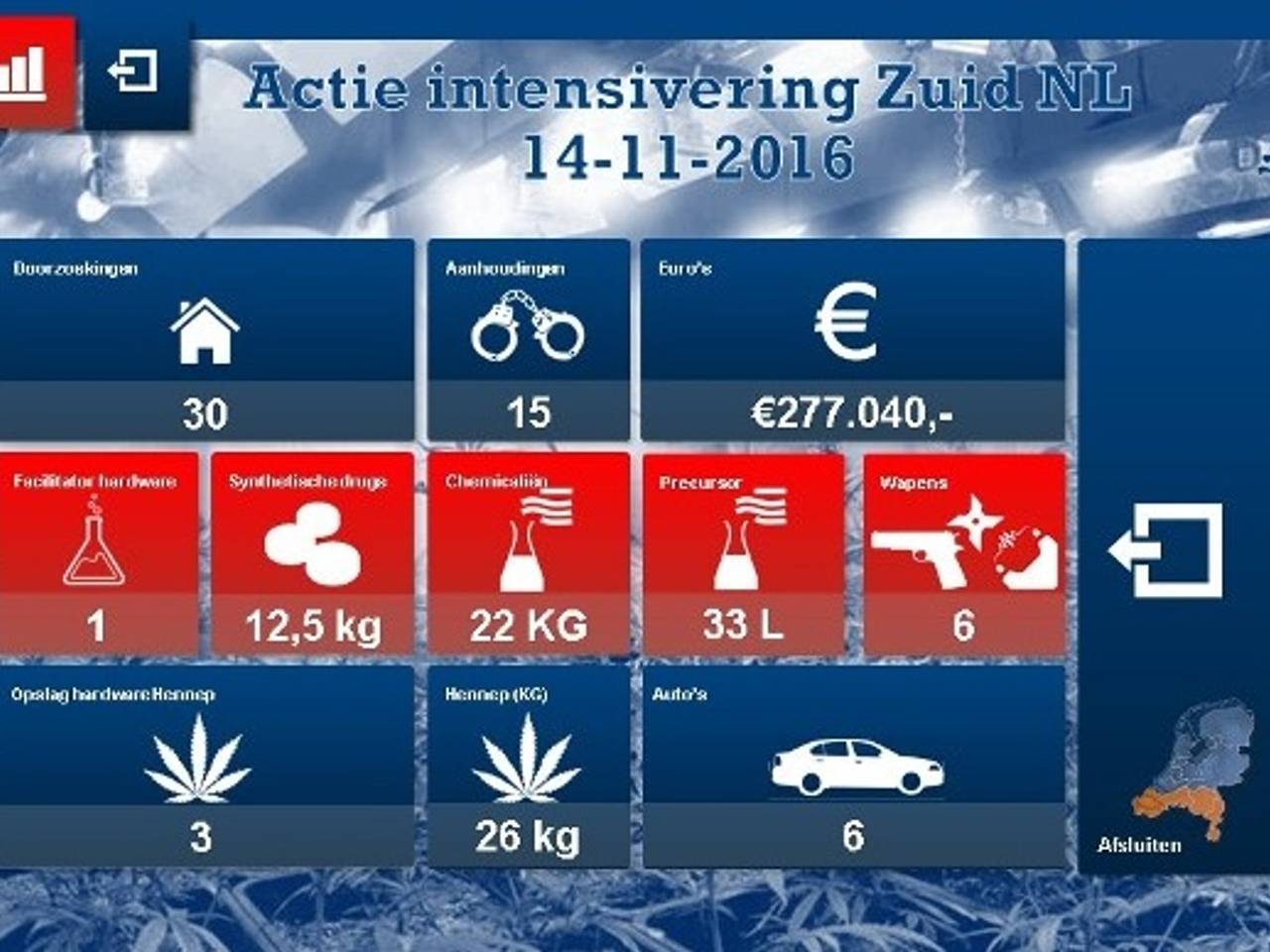 Wéér enorme actie tegen georganiseerde drugscriminaliteit Brabant: 30 doorzoekingen, 15 arrestatiesBij een grootschalige actie tegen drugscriminaliteit in Brabant en Limburg zijn maandag vijftien arrestaties verricht. Bij invallen op dertig plekken werden bovendien wapens, contante geldbedragen, drugs en chemicaliën aangetroffen. In onder meer Valkenswaard, Sprundel, Sint Willebrord, Oisterwijk en Tilburg werden verdachten opgepakt. Maar ook in het Gelderse Aalst en in Amsterdam waren er arrestaties.