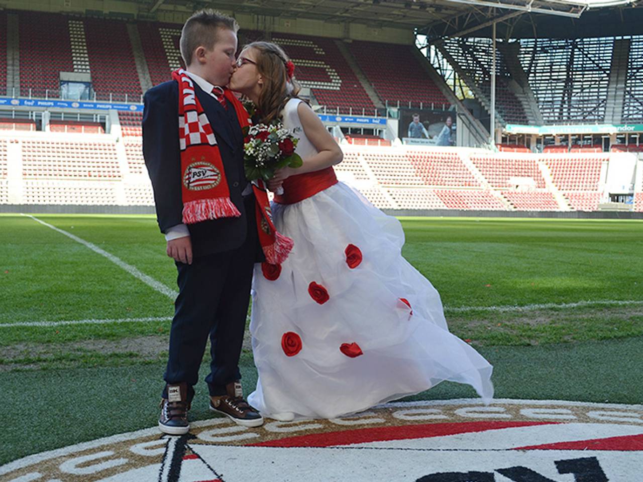 Piepjonge tortelduifjes (10) trouwen in Philips Stadion, trouwringen op kampioensschaal PSV24 april 2015Wat kan liefde toch mooi zijn. Zeker als je op heel jonge leeftijd al weet dat jouw vriendje of vriendinnetje de ware is. Meike van Erp uit Son en Sem van Hal uit Bergeijk, allebei 10 jaar oud, beleefden woensdag een héél bijzondere dag. Het tweetal gaf elkaar het ja-woord in het Philips Stadion van PSV.