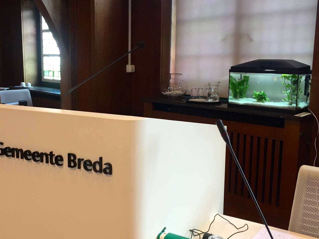 Aquarium met tien guppen moet grimmige sfeer in Bredase raadszaal verbeterenIn de Bredase raadszaal staat sinds deze week een aquarium om de angel uit de politieke arena te halen. In de gemeenteraad heerst volgens politici al tijden een ongezellige sfeer. Zo wordt er volgens raadsleden niet meer inhoudelijk vergaderd, maar vooral op de man gespeeld.