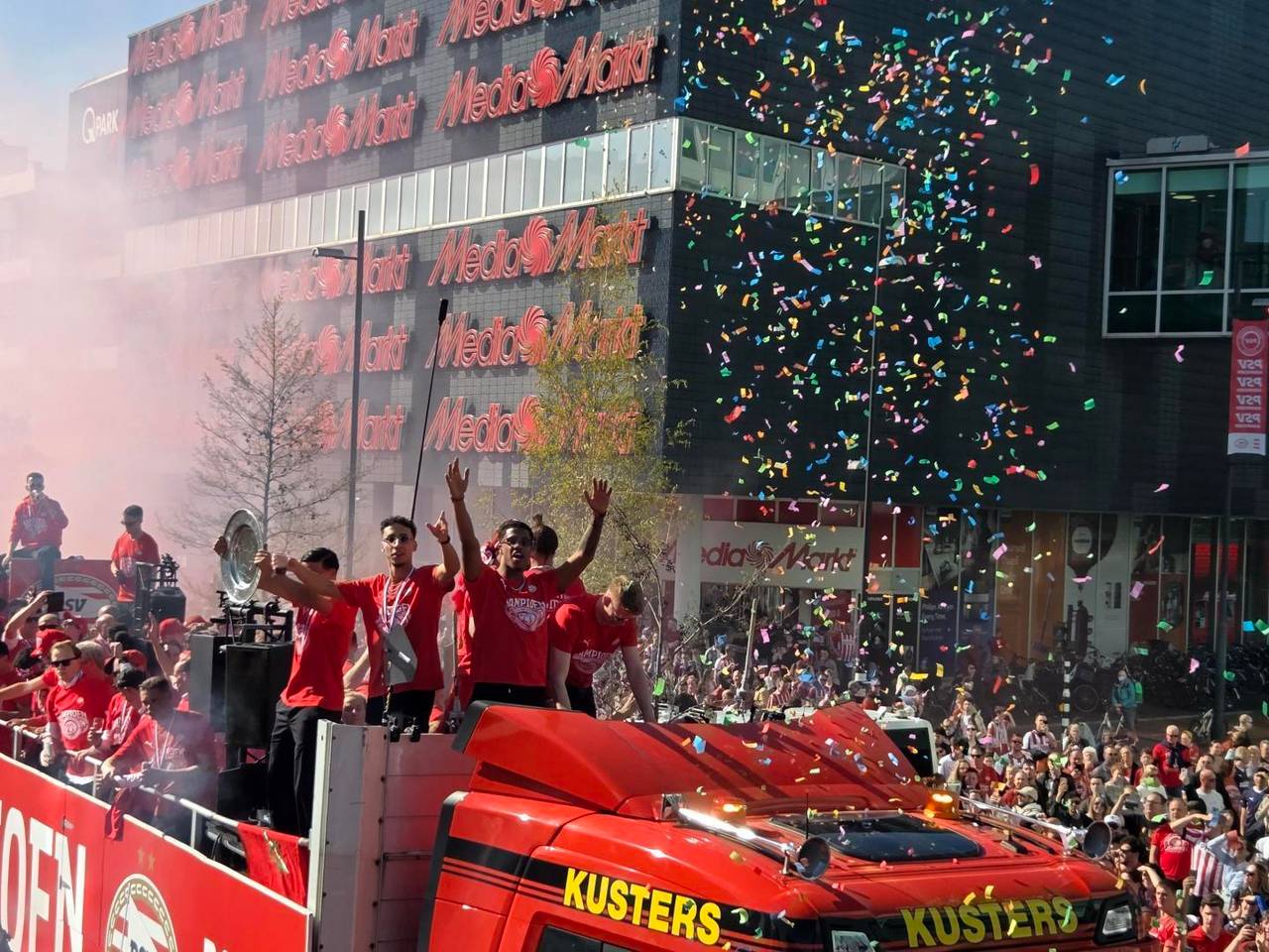 LIVEBLOGLIVE | PSV gehuldigd op Stadhuisplein, fans in de hele stad vieren feestdinsdagDe voetballers van PSV zijn dinsdag gehuldigd in het centrum van Eindhoven vanwege hun derde landstitel op rij. Op de platte kar maakte de selectie van coach Peter Bosz een ereronde door de stad. Aan het eind van de middag kwamen de spelers aan bij het stadhuis waar ze op het bordes werden toegejuicht door een grote menigte.